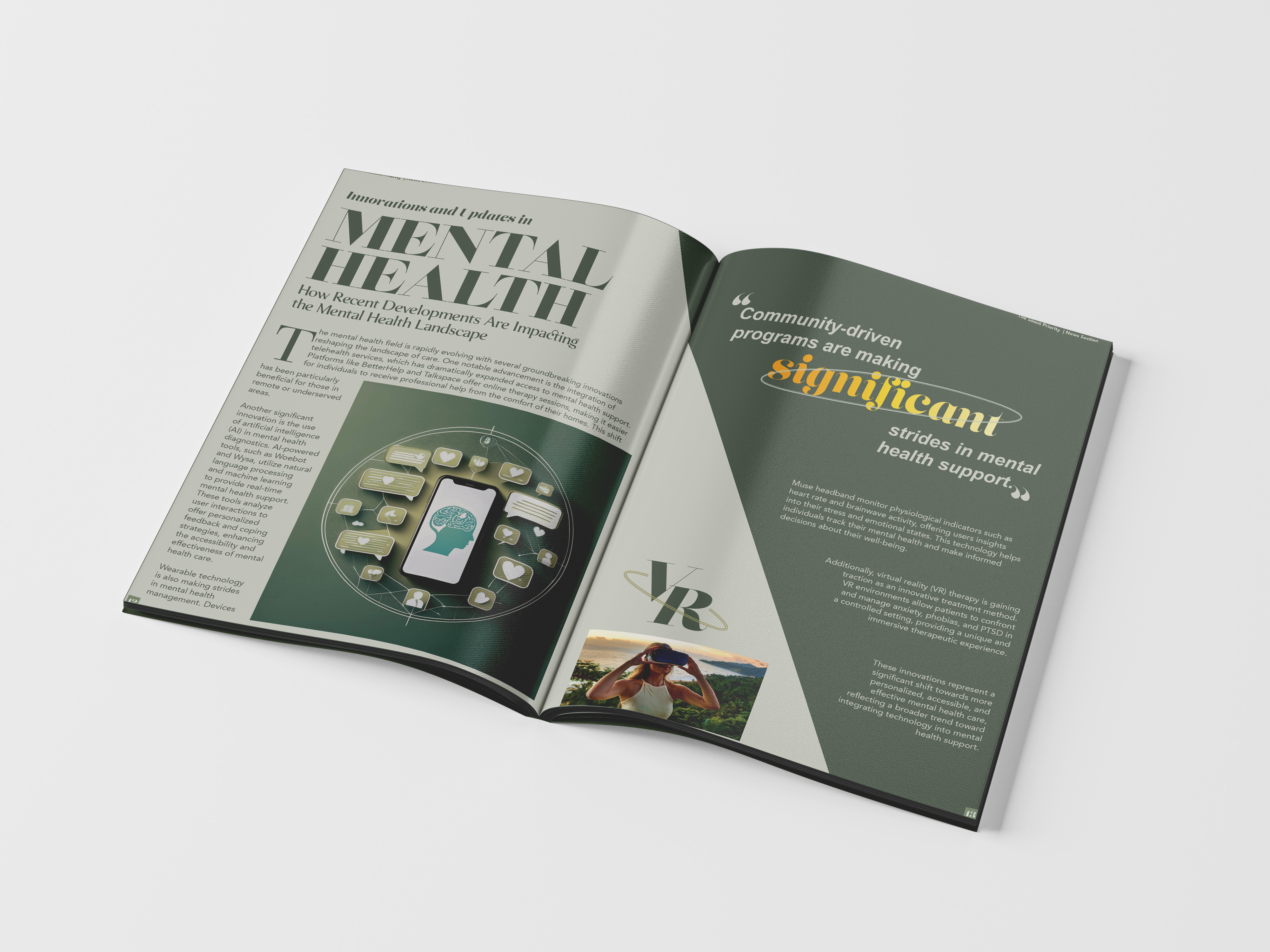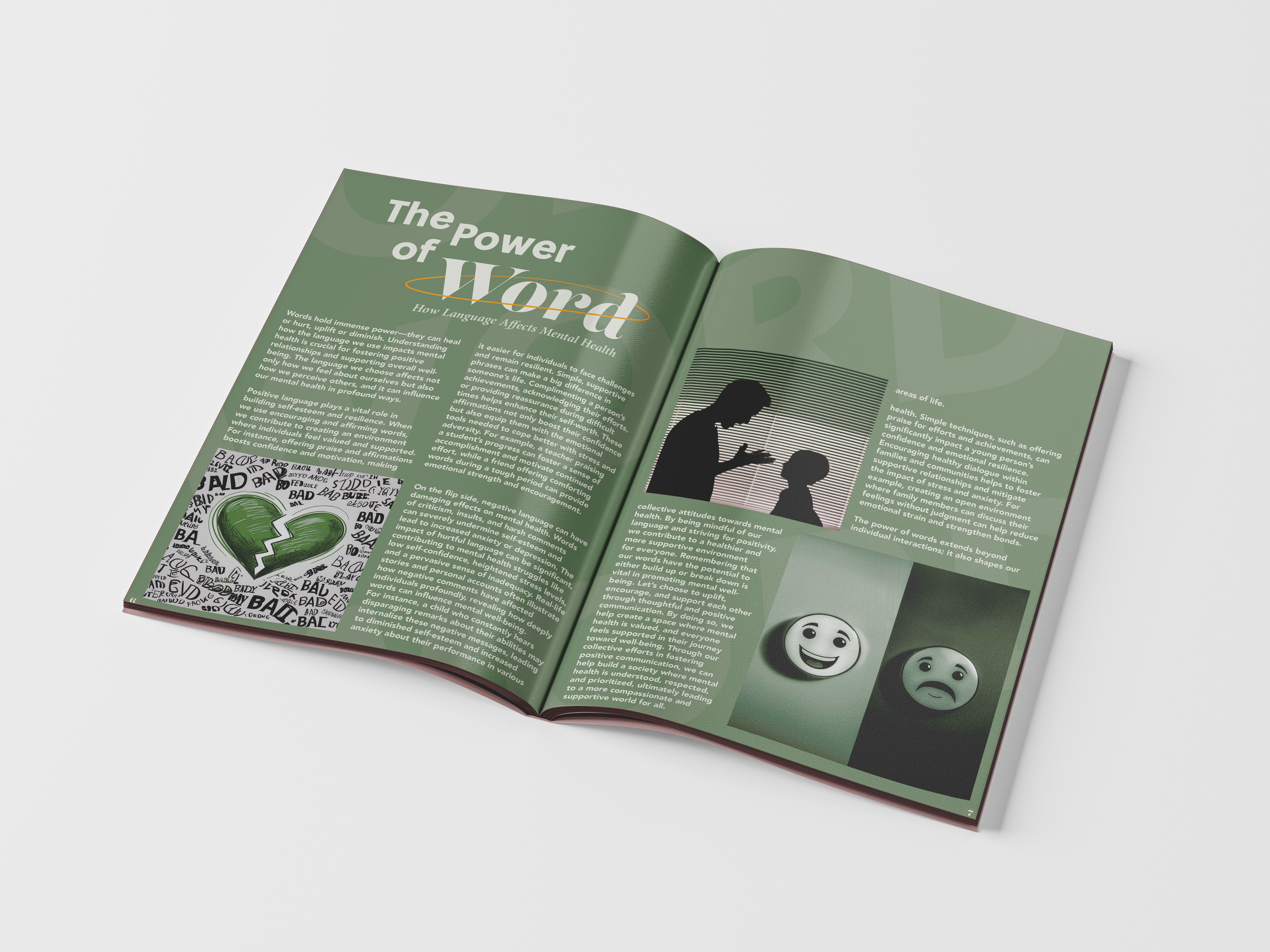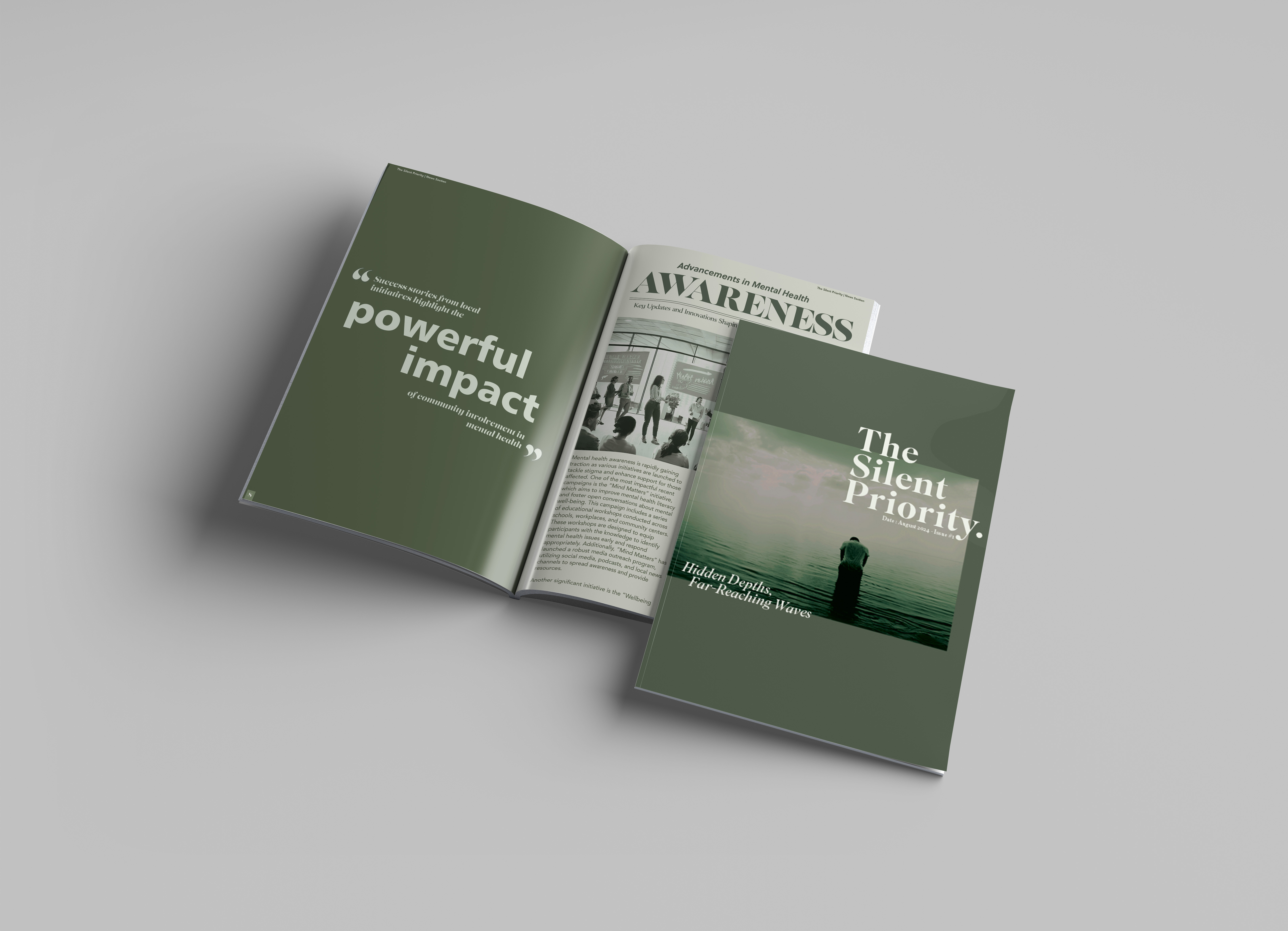 In this publication, I’ve explored the power of typography to create engaging pull quotes that invite readers to reflect on mental health. The serene monotone green palette symbolizes growth, harmony, and tranquility, enhancing the visual experience and promoting a sense of calm. By marrying impactful design with thoughtful content, I aim to foster an environment where conversations about mental well-being feel approachable and inspiring.