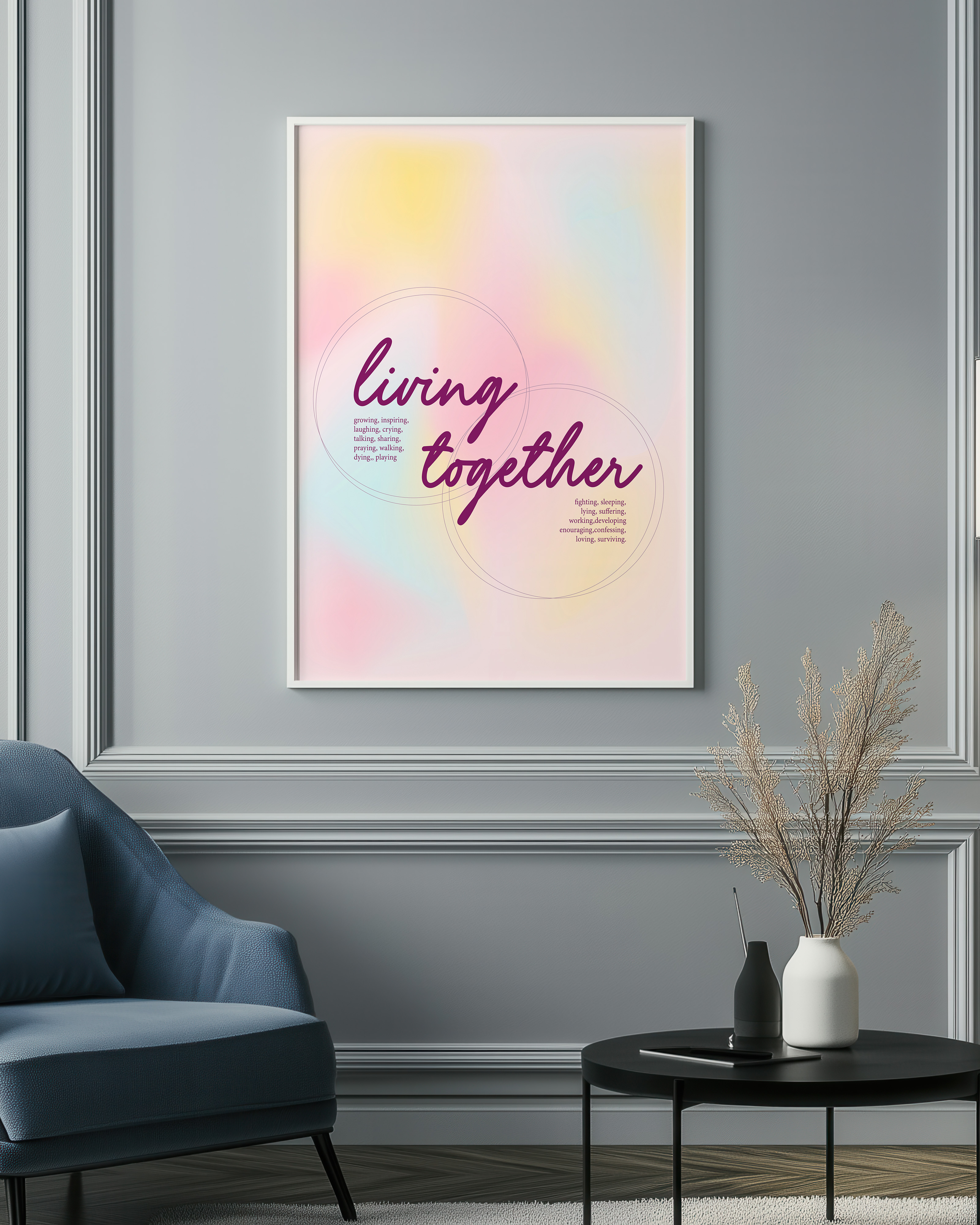 “Living Together” – A poster design celebrating unity, brought to life with a pastel palette of pink, blue, and yellow inspired by Taylor Swift’s soft, harmonious tones. This artwork embodies warmth and connection through a fresh, uplifting color scheme.